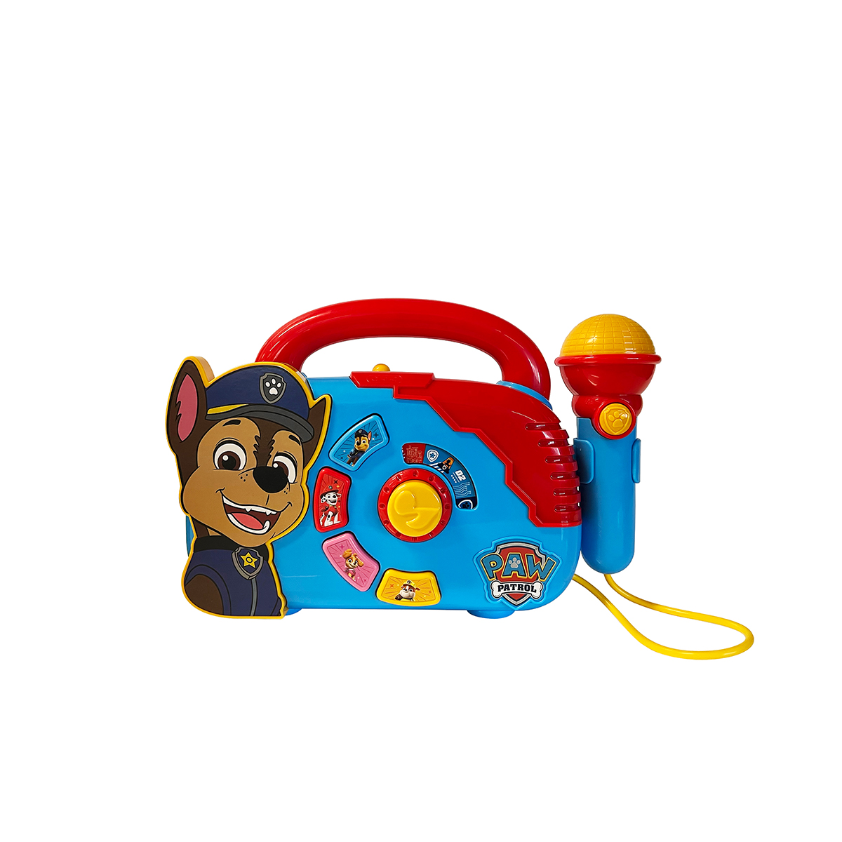 Singen Sie auch unterwegs mit Chase! Drehe das Stimmgerät, um deinen Song auszuwählen, und drücke die leuchtenden Tasten, um eine Instrumentenschicht hinzuzufügen. Erstelle deine eigenen Lieder! Enthält das Paw Patrol-Thema und 2 weitere Kinderlieder mit der Option, 3 Instrumente darüber zu legen. Mit einem funktionierenden Mikrofon ist es das perfekte Spielzeug zum Mitsingen. Drücke einfach auf das PAW-Abzeichen, um das Mikrofon zu aktivieren. In Kombination mit dem Tragegriff kannst du können Sie die Party überallhin mitnehmen!