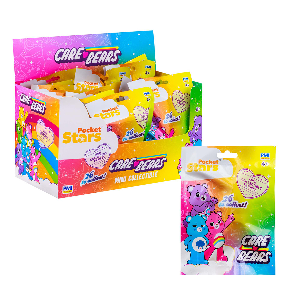 Care Bears mit der Grösse von 5 cm, 24 Stück im Display – 26 Modelle zum Sammeln. Jeder Folienbeutel enthält 1 Sammelfigur und eine 4-farbige Broschüre. Beflockte Figuren, Figuren mit Zubehör und galvanisierte Designs sind enthalten.
