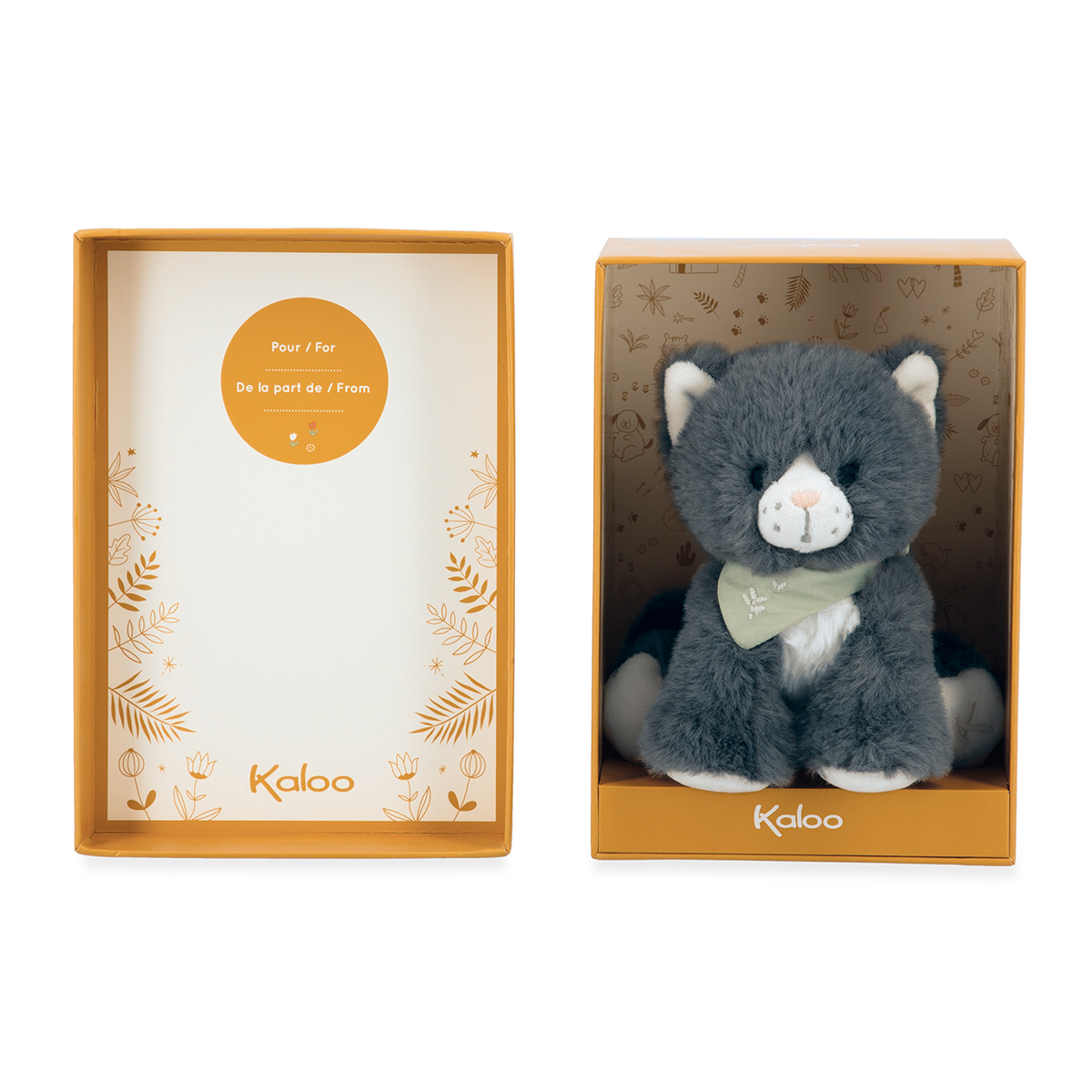 Chamallow ist ein kleines Fellbündel voller Liebe. Baby wird sein weiches Fell lieben und sofort Lust zum Kuscheln bekommen. Er wird der ideale Gefährte für Ihr Baby sein. Sein kleines blaues Halstuch - Emblem von Kaloos Kollektion verleiht ihm eine liebenswerte und moderne Optik. Mit seinem weichen Körper und seinen kleinen Pfoten ist er der ideale Gefährte, um das Greifen zu trainieren. Dieser 14 cm grosse Plüschkater wird Baby in eine Welt voller Liebe entführen.