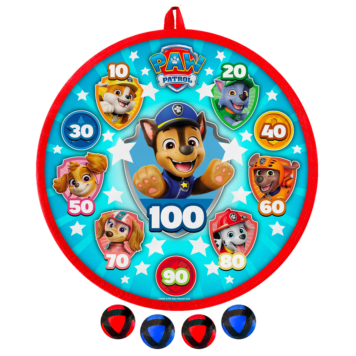Weiche Klettbälle und eine 28 cm große Zielscheibe. Sicheres Dartspiel für Kinder – im Paw-Patrol-Stil.