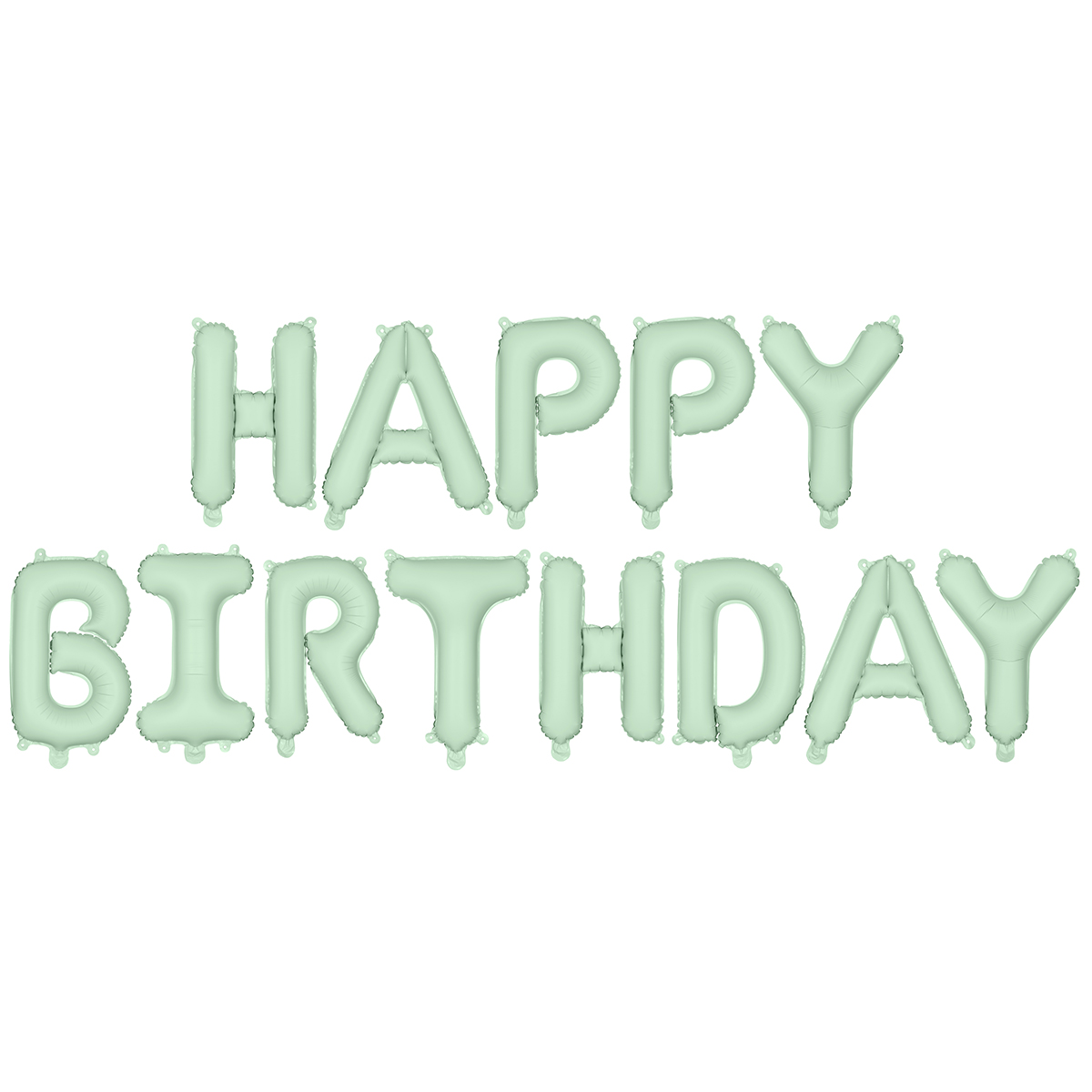 Matter Happy Birthday Folienballon in grün, Masse ca. 340 x 35 cm. Zum Aufblasen mit Luft. Der Ballon ist selbstverschliessend und hat 4 Haken zur einfachen Befestigung an einem Band.