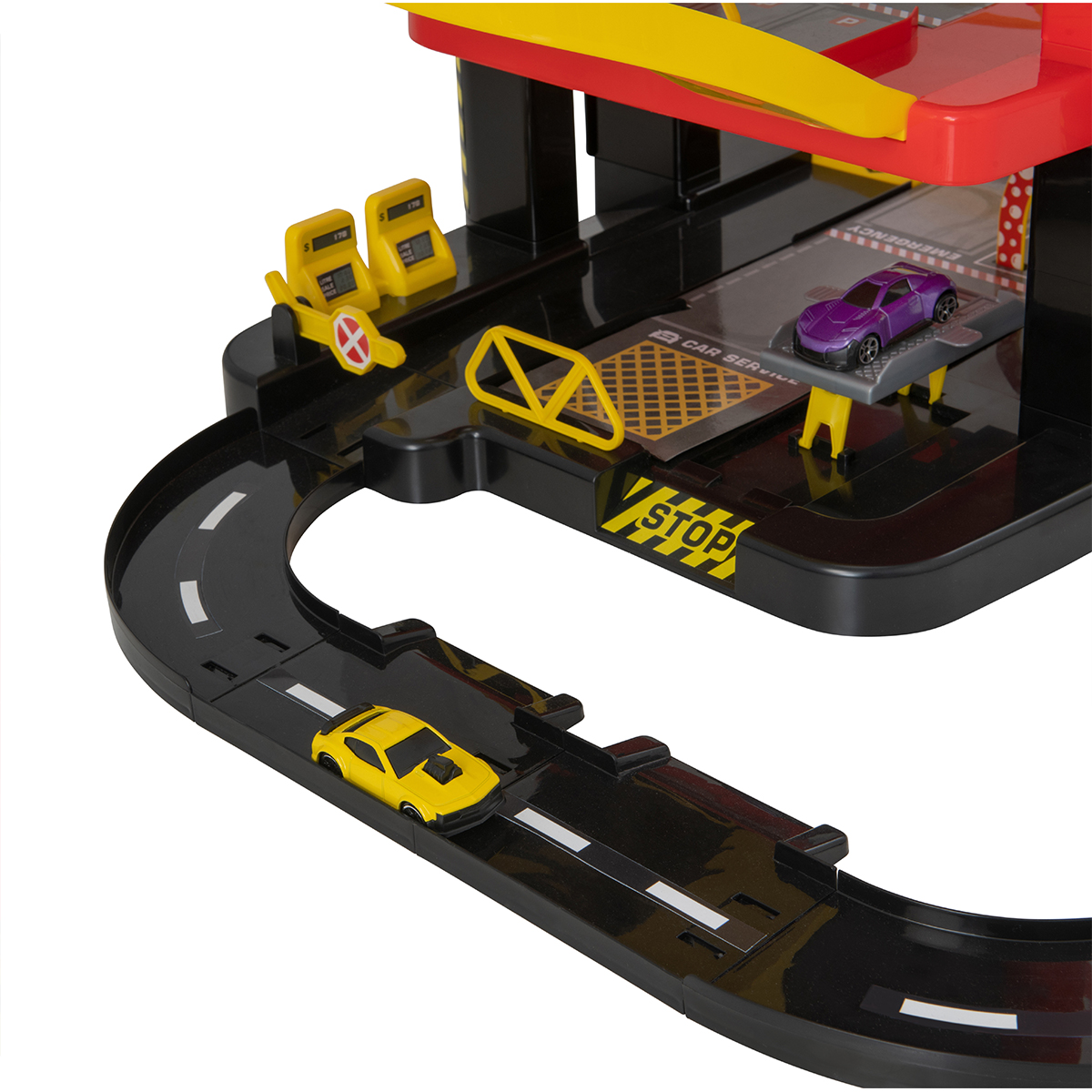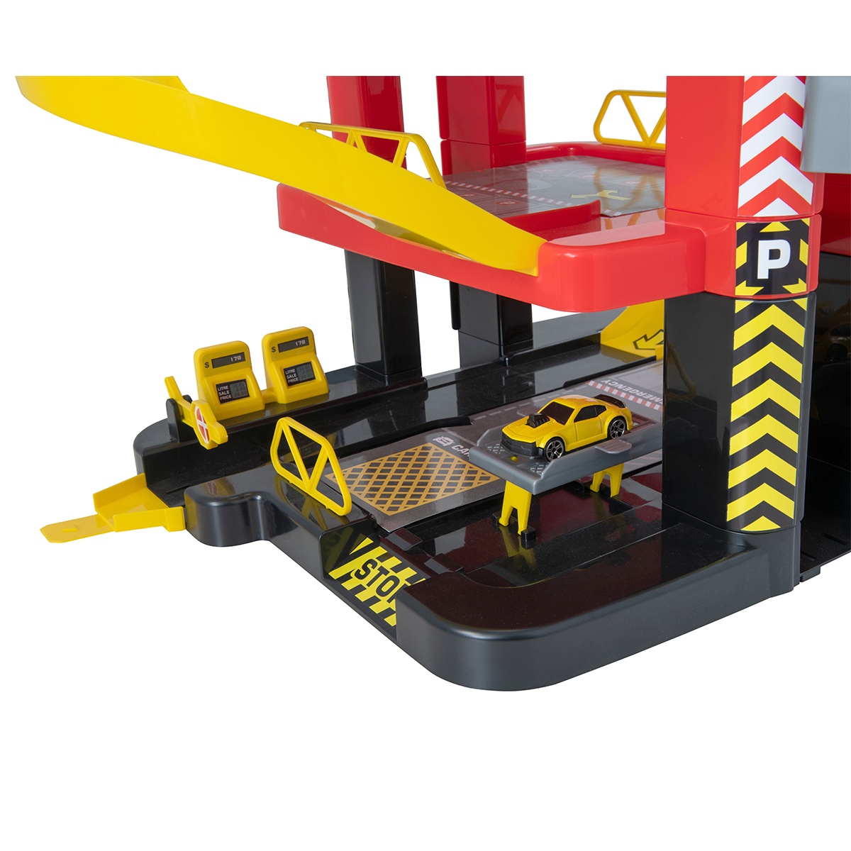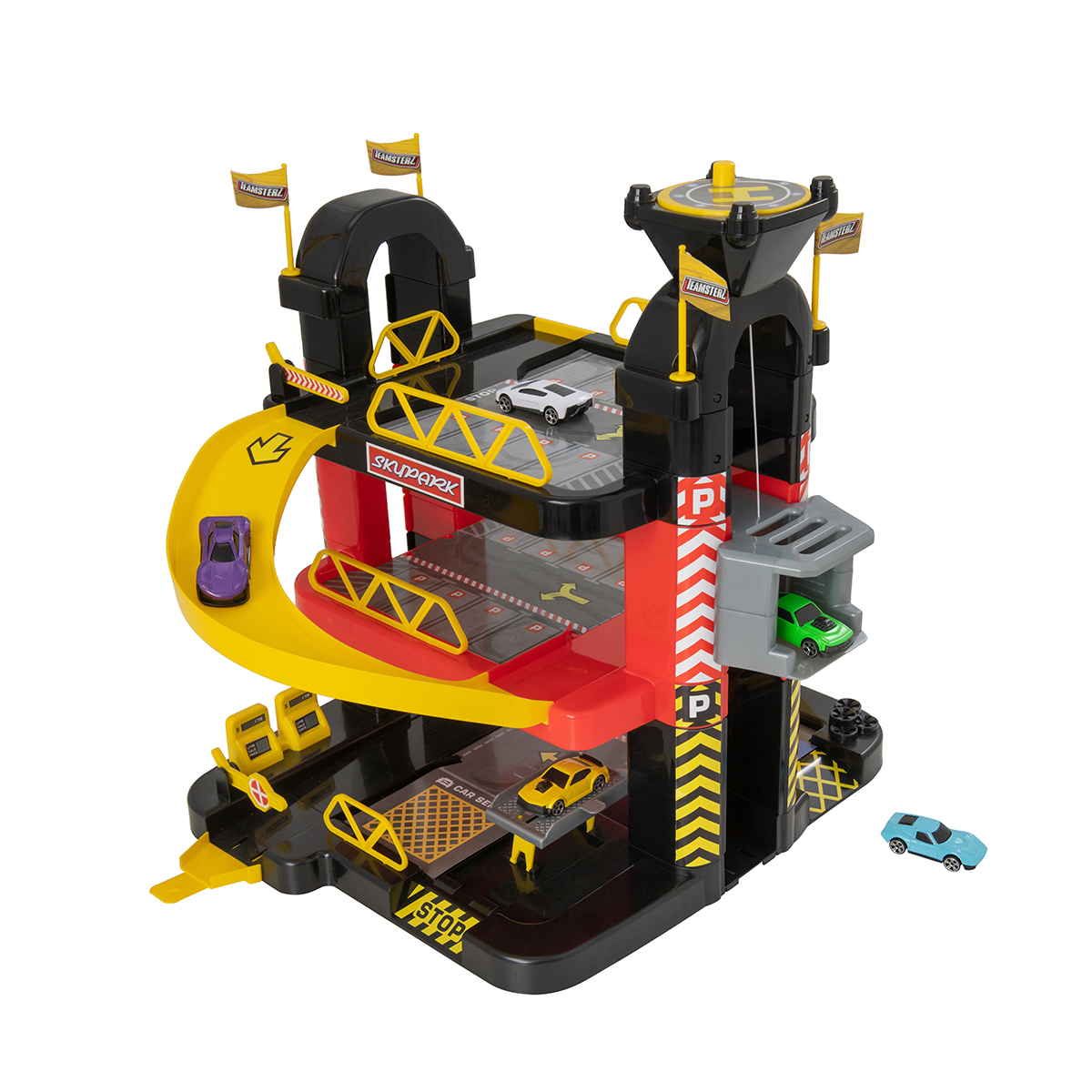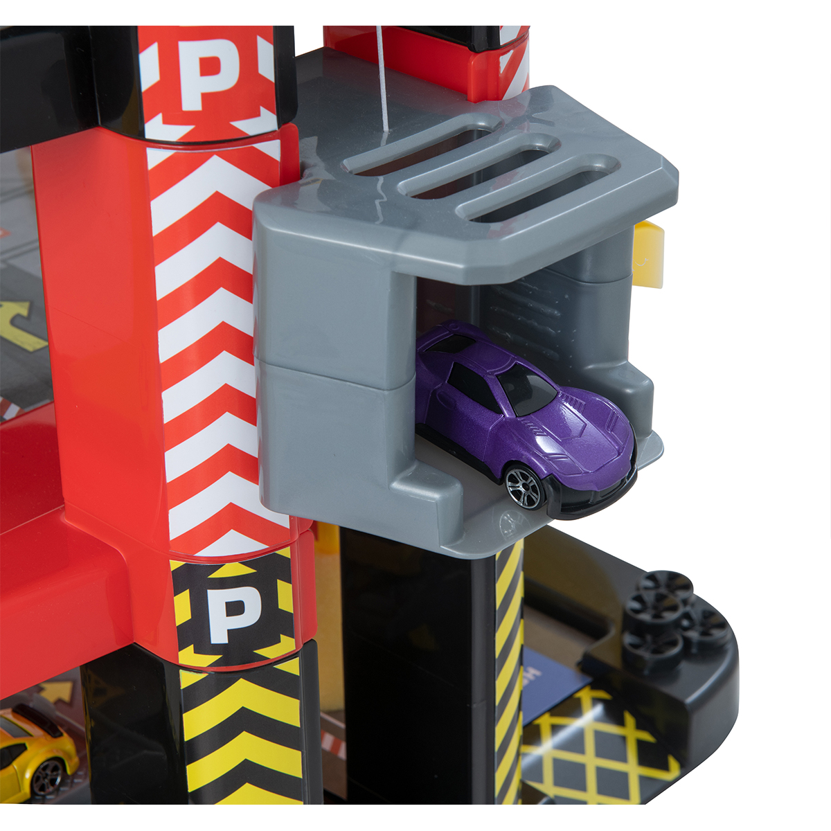 Teamsterz Metro City 3-stöckiges Parkhaus mit 5 Teamsterz-Autos! Ausstattung: Verbindungsrampen zwischen den Etagen, Schranken, Zapfsäulen, Autowaschanlage, Inspektionsrampe, Hubschrauberlandeplatz, funktionierender Aufzug und Parkplätze. Kann mit extrudierten Schienen verbunden werden, um mehr Spielmöglichkeiten zu bieten. Teamsterz-Autos verfügen über eine hochwertige Druckgusskarosserie und unabhängig voneinander frei bewegliche Räder! Kompatibel mit 3-Zoll- und 4-Zoll-Fahrzeugen