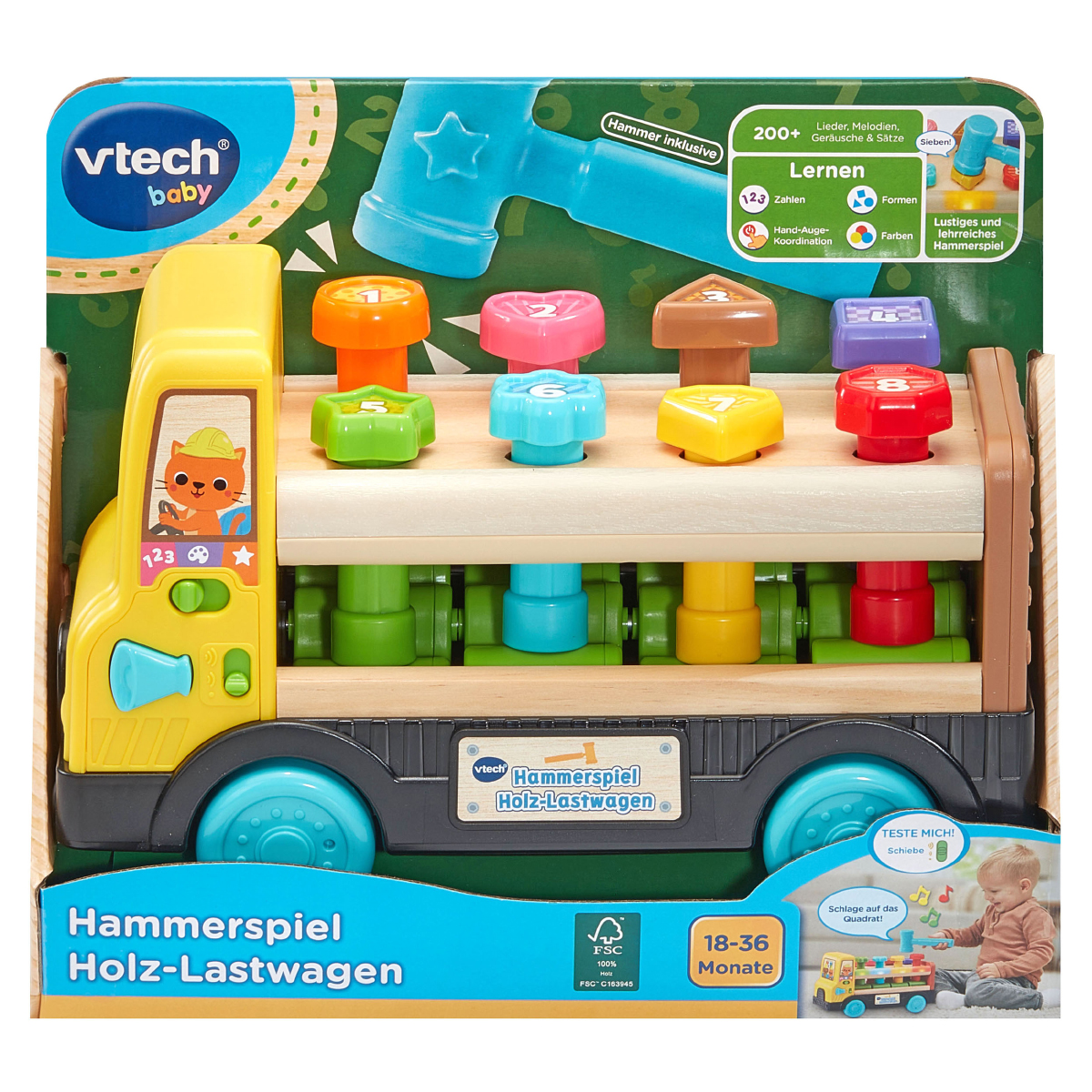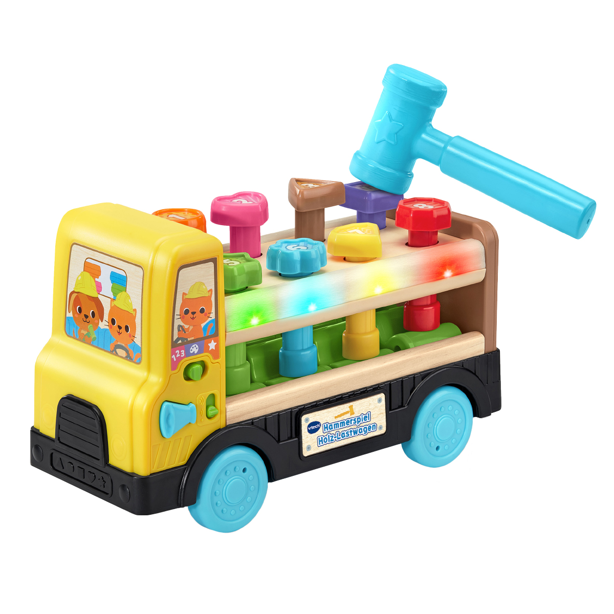 Draufhauen mit dem interaktiven und leuchtenden Lastwagen! Bunter Lastwagen, der teilweise aus FSC-zertifiziertem Holz besteht, mit beigelegtem Hammer, mit welchem man auf die Formen schlagen kann. 3 Spielmodi: Zahlen bis 8 lernen, Farben lernen und Formen lernen. 8 unterschiedliche Stifte mit unterschiedlichen Zahlen und Farben: Schlägt man mit dem Hammer auf eine Form, senkt sich diese und eine andere schießt hoch. Schlägt man auf einen Stift, benennt der Lastwagen dessen Farbe. Das Licht an der Seite des Lastwagens leuchtet in unterschiedlichen Farben, was das Kind animiert, die Form mit der entsprechenden Farbe zu finden. Die Musikschaltfläche löst Lieder über Zahlen, Farben und Fahrzeuge aus.