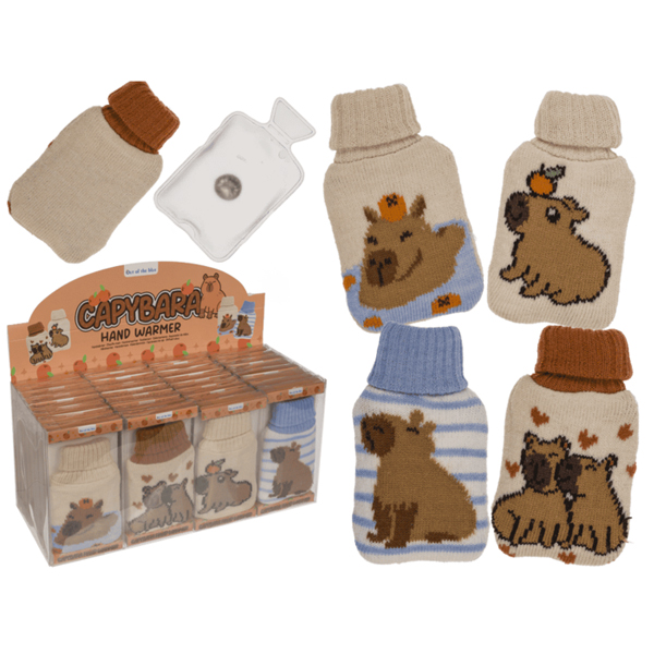 Handwärmer, Wärmflasche mit Stricküberzug, Capybara, 11 cm, 4-fach sortiert, in PET Box, 32 Stück im Display