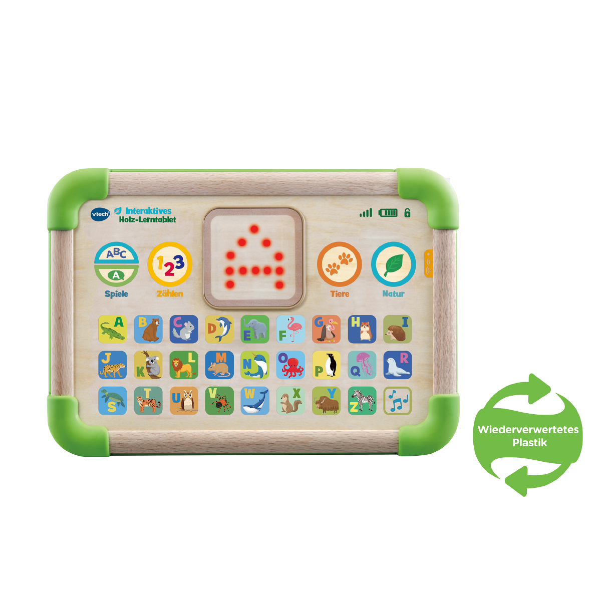 Mit dem Interaktiven Holz-Lerntablet aus nachhaltigen Materialien lernt das Kind spielerisch viel Neues kennen! Mit dem lustigen Holztablet Tiere, Buchstaben, Zahlen und die Natur entdecken. 4 Modustasten zu Buchstaben, Zahlen, Tieren sowie dem Wetter und um Suchspiele (nach bestimmten Buchstaben und Tieren) zu spielen. 26 Buchstabentasten, um Buchstaben, Laute, Tiere und ihre Lebensräume kennenzulernen. Leuchtender LED-Bildschirm, auf dem Buchstabe und lustige Animationen zu sehen sind.