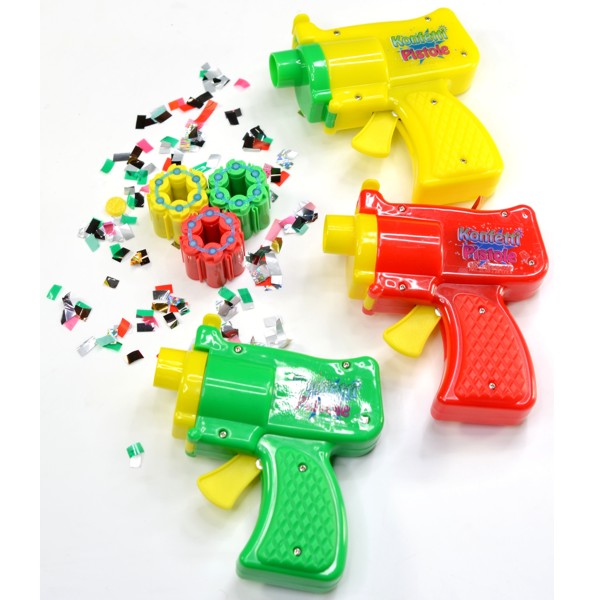 Konfetti Pistole assortiert in gelb, rot und grü inkl. 3x Munition à 6 Schuss.