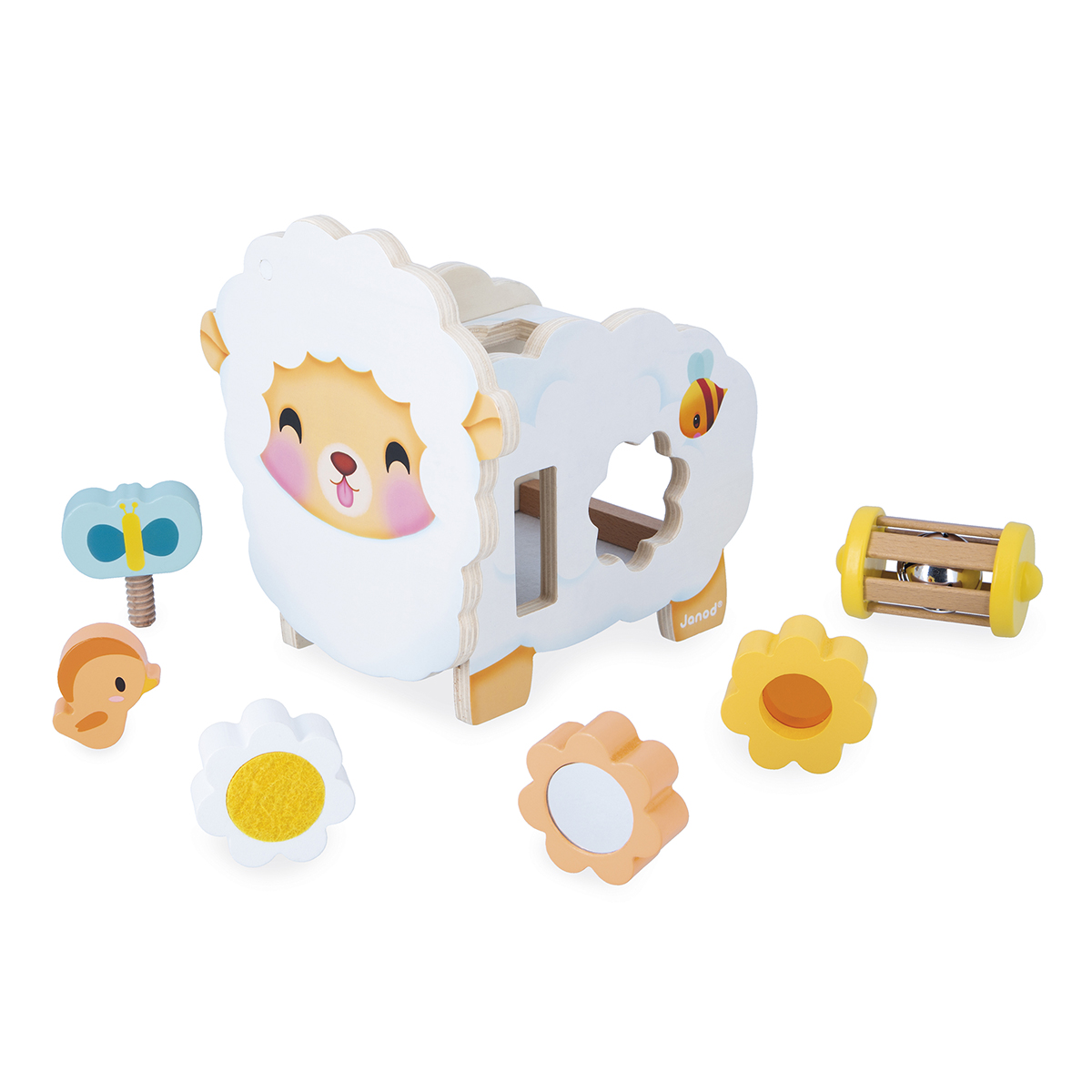 Hier ist das niedlichste aller Janod-Schafe! Es wird mit 6 Zubehörteilen geliefert, die auf und in dem Schaf verstaut werden können. Der kleine Vogel ist magnetisch und nistet auf dem Kopf. Auf dem Rücken des Schafs können die Rassel und der anschraubbare Schmetterling befestigt werden. Die Blumen werden in die Seiten gesteckt. Das Baby wird darin einen Spiegel, ein Kratz-Element und ein durchsichtiges Plexiglas-Element entdecken, durch das es die Welt in Orange betrachten kann. Fördert Feinmotorik und die Vorstellungskraft von Kindern. Spielzeug aus Holz. Motorikspielzeug für Kinder ab 12 Monaten.