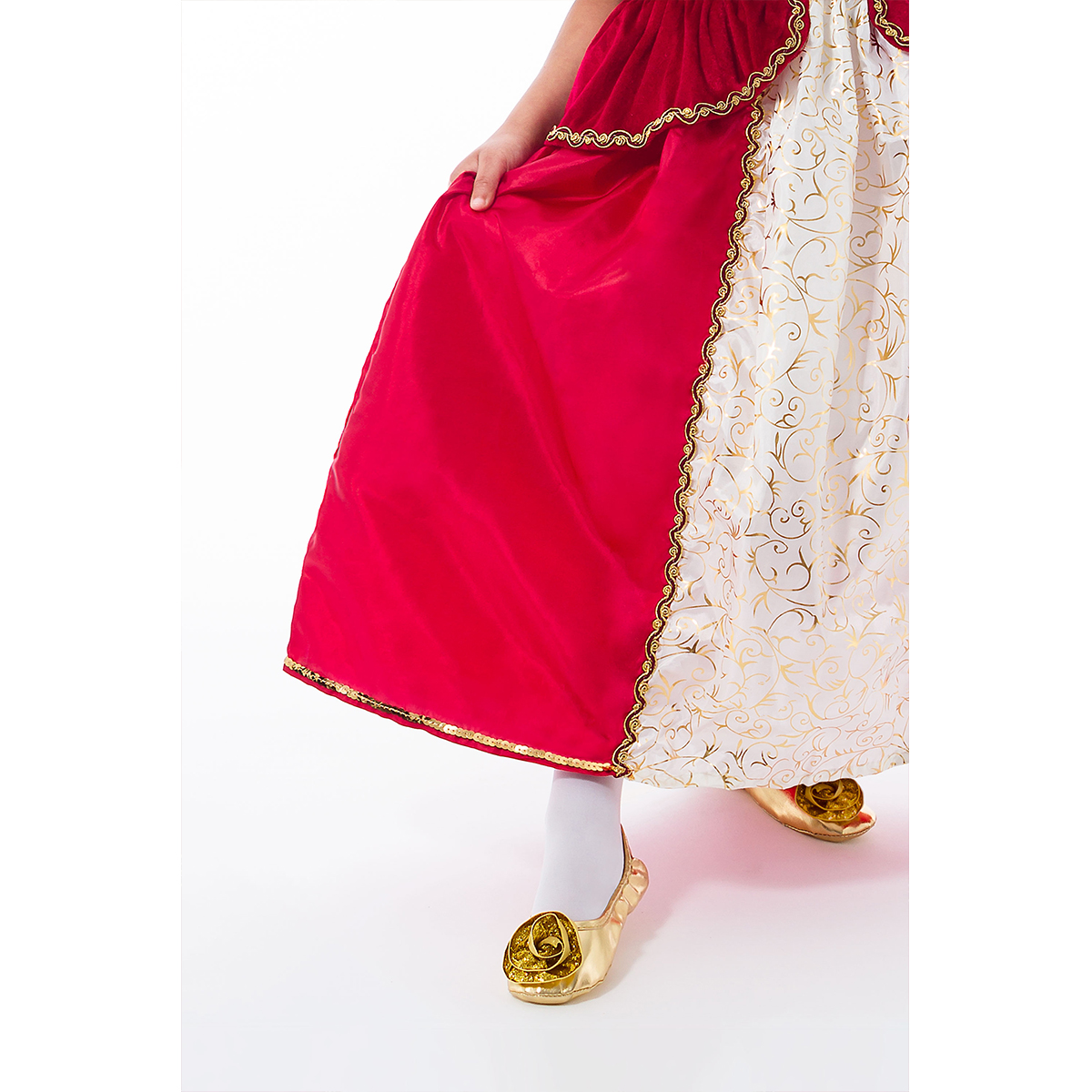 Dieses Kleid ist ein echter Klassiker und perfekt für Herbst, Winter oder eigentlich jede Jahreszeit. Es ist eine ideale Ergänzung für die Kostümsammlung Ihres Kindes. Das tiefrote, dehnbare Samtoberteil ist mit einem Steppmuster, goldenen Borten und einer roten Rose verziert. Die halblangen Ärmel mit goldenen Borten enden in einer wunderschönen weißen Rüsche. Der rote Rock aus Chinaseide mit einem elfenbeinfarbenen Einsatz in glitzerndem Goldwirbel rundet den luxuriösen Look dieses Kleides ab. Atmungsaktiv, seidig weich, aus 100 % Polyester.