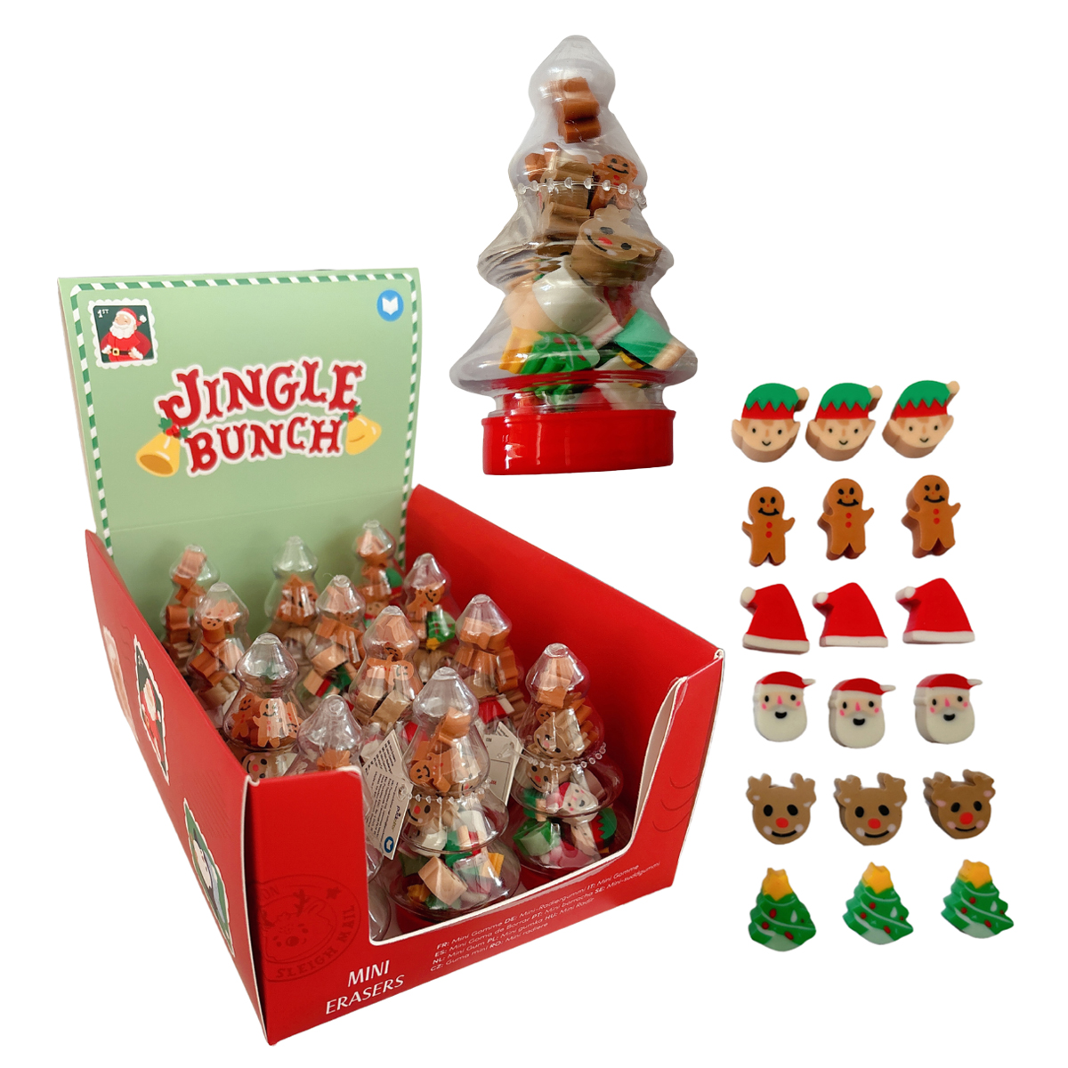 Tanne gefüllt mit verschiedenen herzigen und lustigen Radiergummis in Weihnachtsmotiven