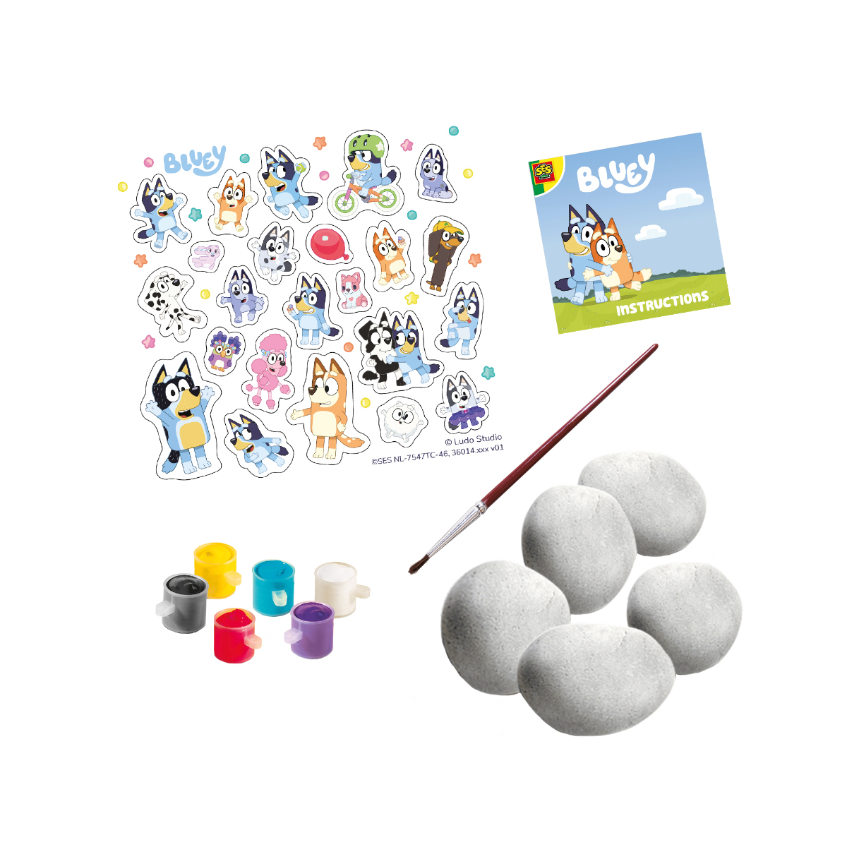 Gestalte wunderschöne Steine mit Bluey! Mit diesem Set kannst du die weißen Steine in deinen Lieblingsfarben bemalen und mit den beiliegenden Bluey-Stickern verzieren. Die Sticker lassen sich leicht anbringen. Perfekt für Kinder, die gerne basteln und Bluey lieben! Was dieses Set so toll macht: Bastelspaß mit Bluey und ihren Freunden. Mit den verschiedenen Bluey-Stickern gelingt im Handumdrehen ein wunderschönes Ergebnis. Fördert Kreativität und Feinmotorik. Inhalt des Sets: 6 Farben Farbe, Bluey-Sticker, 5 Steine, Pinsel und Anleitung.