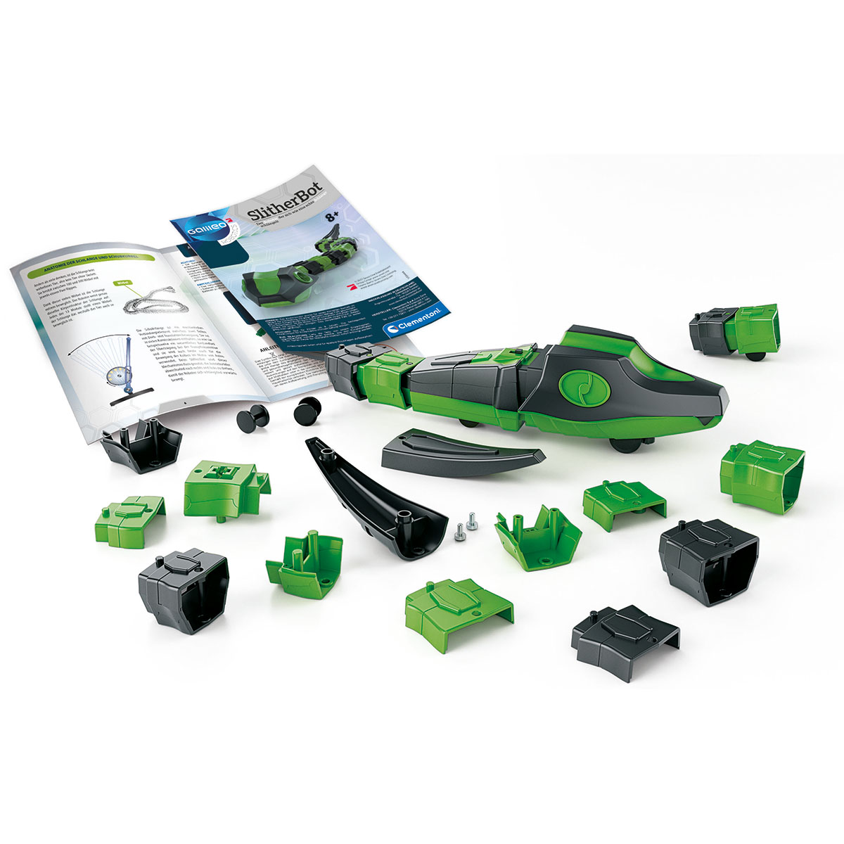 SlitherBot. Eine Schlange zum Zusammenbauen, die zum Leben erwacht und beginnt, sich durch den Raum zu schlängeln, als ob sie echt wäre! Ein Roboter, der sich durch den Raum bewegt, für ein unübertroffenes Spielerlebnis. Eine 40 cm lange Schlange, mit der die Interaktion noch mehr Spass macht. Nachdem die 12 oberen Komponenten an den unteren Teilen befestigt wurden, schaltet man einfach den Roboter ein, um zu sehen, wie er sich bewegt. Nun kann das Abenteuer beginnen. Der Motor verfügt über ein spezielles Getriebe, das die Pleuelstange einmal nach rechts und einmal nach links bewegt. Auf diese Weise bewegt sich das Tier durch geschmeidiges und realistisches Schlängeln vorwärts. Nach dem Einschalten beginnt der Roboter, sich um das Kind herum zu schlängeln und gelangt in kleine Spalten oder Ecken, wie eine echte Schlange. Man kann nicht widerstehen, seinen Freunden schreckliche Streiche zu spielen! Der modulare Aufbau des SlitherBot bildet einige extrem realistische Windungen nach, genau wie die einer echten Schlange.