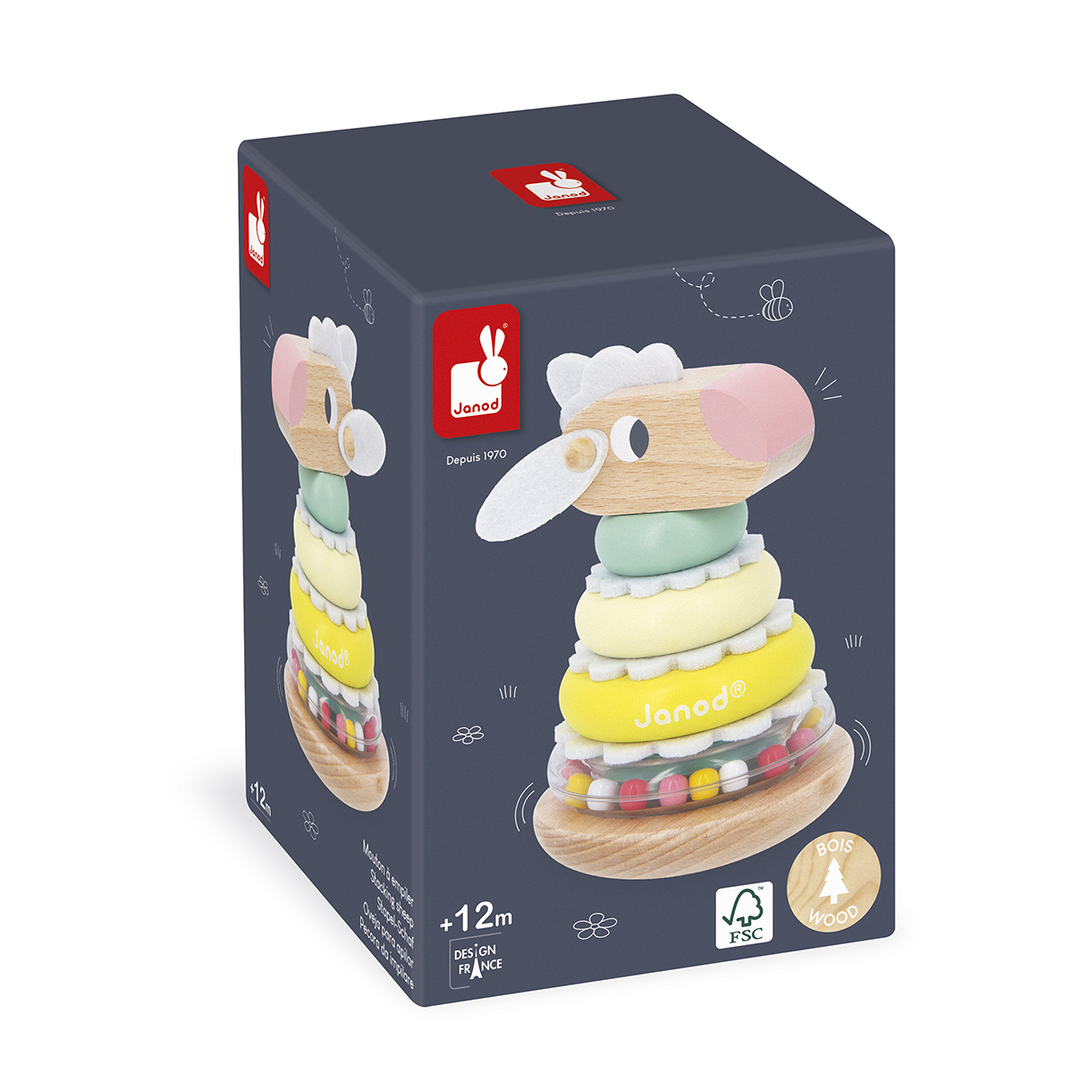 Ein Schaf zum Stapeln ... und Schütteln! Dieses hübsche bunte Schaf lässt sich Stück für Stück zusammensetzen: ein durchsichtiger Ring, der mit bunten Perlen gefüllt ist, drei Holzringe in verschiedenen Größen, drei Filzelemente zum Zwischenlegen und zu guter Letzt sein weicher Schafskopf, der oben auf den Stapel gesteckt wird! Nach dem Zusammenbau lässt sich das Schaf dank des abgerundeten Sockels in eine Stehauf-Figur verwandeln und sorgt so für noch mehr Spaß. Dieses Stapelspielzeug ist ideal zur Förderung von Feinmotorik und Hand-Augen-Koordination. Spielzeug aus Aus Holz. Spielzeug für Kinder ab 12 Monaten.