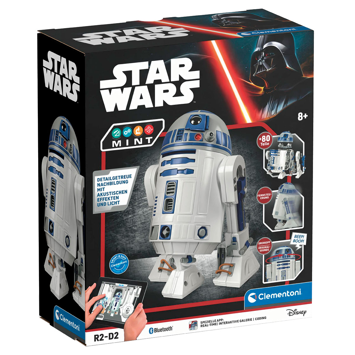 Star Wars R2D2. Der Clementoni R2-D2 Roboter, der von einer der beliebtesten Figuren der Skywalker-Saga inspiriert wurde. Der R2-D2 besteht aus mehr als 80 Teilen, die zusammengebaut werden können, verfügt über rote und blaue LED-Leuchten und gibt die Originalgeräusche aus der Saga wieder. APP-Funktionen: Echtzeit für sofortige Befehlsreaktionen, Coding zum Erlernen der Programmiergrundlagen und eine interaktive Galerie, in der du sehen kannst, wie R2-D2 auf andere Figuren reagiert. R2-D2 kann seinen Kopf um 180° drehen, genau wie in der Original-Saga. Ein tolles Set, das Kindern die Grundsätze der Robotik mit einem unterhaltsamen, integrierten MINT-Ansatz vermittelt.