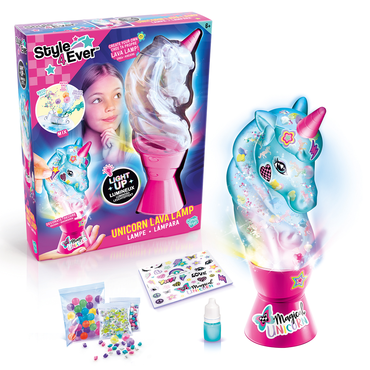 Kreiere deine eigene Einhorn-Lavalampe mit all dem mitgelieferten Zubehör (Perlen, Dekorationen, Farbe...). Personalisiere sie mit den Aufklebern! Drehe den Sockel. Wow, sie leuchtet auf und macht Wirbel!