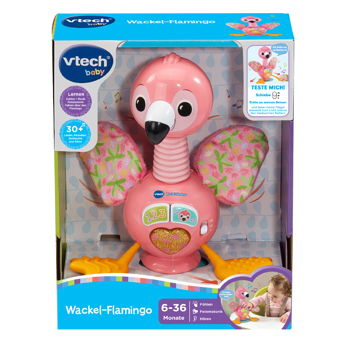 Zeit für tierisch lustigen Wackelspaß! Fröhlicher Flamingo, der leuchtet, singt und lustig umherwackelt. Durch Ziehen an den weichen Silikonbeinen flattert der Flamingo mit den Flügeln und spielt passende Sätze, kurze Melodien und Geräusche ab. 2 bunte Tasten: Durch Drücken der Zahlentaste lernt das Kind spielerisch die Zahlen von 1 bis 3 und hört dazu passende Fakten über den Flamingo sowie Geräusche. Das Drücken der Flamingotaste löst Lieder und Melodien aus. Das Herz auf dem Bauch des Flamingos leuchtet passend zu Sätzen, Liedern und Geräuschen. Unterschiedliche Texturen an den Beinen sowie die Bewegungen der Flügel und der Beine fördern die Feinmotorik und die sensorische Wahrnehmung. Lerninhalte: Zahlen, Musik, Feinmotorik, Fakten über den Flamingo.Die Flügel sind aus weichem Knisterstoff, die Beine und der Hals aus beweglichem Silikon. Dank des Saugnapfs kann der Flamingo auf Hochstühlen, Tischen etc. befestigt werden. 3 gesungene Lieder und 10 Melodien. Kindersicheres Batteriefach, Abschaltautomatik und Lautstärkeregler