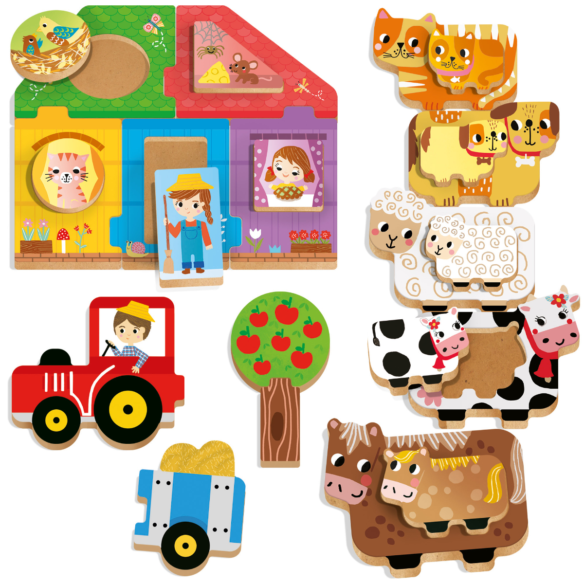 Formen, Farben und erste logische Fähigkeiten! Eine originelle und unterhaltsame Kollektion pädagogisch wertvoller Holzspielzeuge. Dazu gehören ein Formen- und Farbenhaus, stapelbare Muttertiere mit ihren Babys sowie bezaubernde Zuordnungsspiele. Die Spiele sind selbstkorrigierend und mit speziell für Kleinkinder entwickelten Haken ausgestattet. Förderung der frühen logischen Fähigkeiten, Formen und Farben erkennen, Feinmotorik. Primäre Intelligenz: logisch-mathematisch. Weitere Intelligenzen: visuell-räumlich und körperlich-kinästhetisch. Inhalt: Haus mit 5 geometrischen Formen, 5 Tiere mit je 5 Babys, 1 Traktor mit Anhänger und 1 kleiner Baum