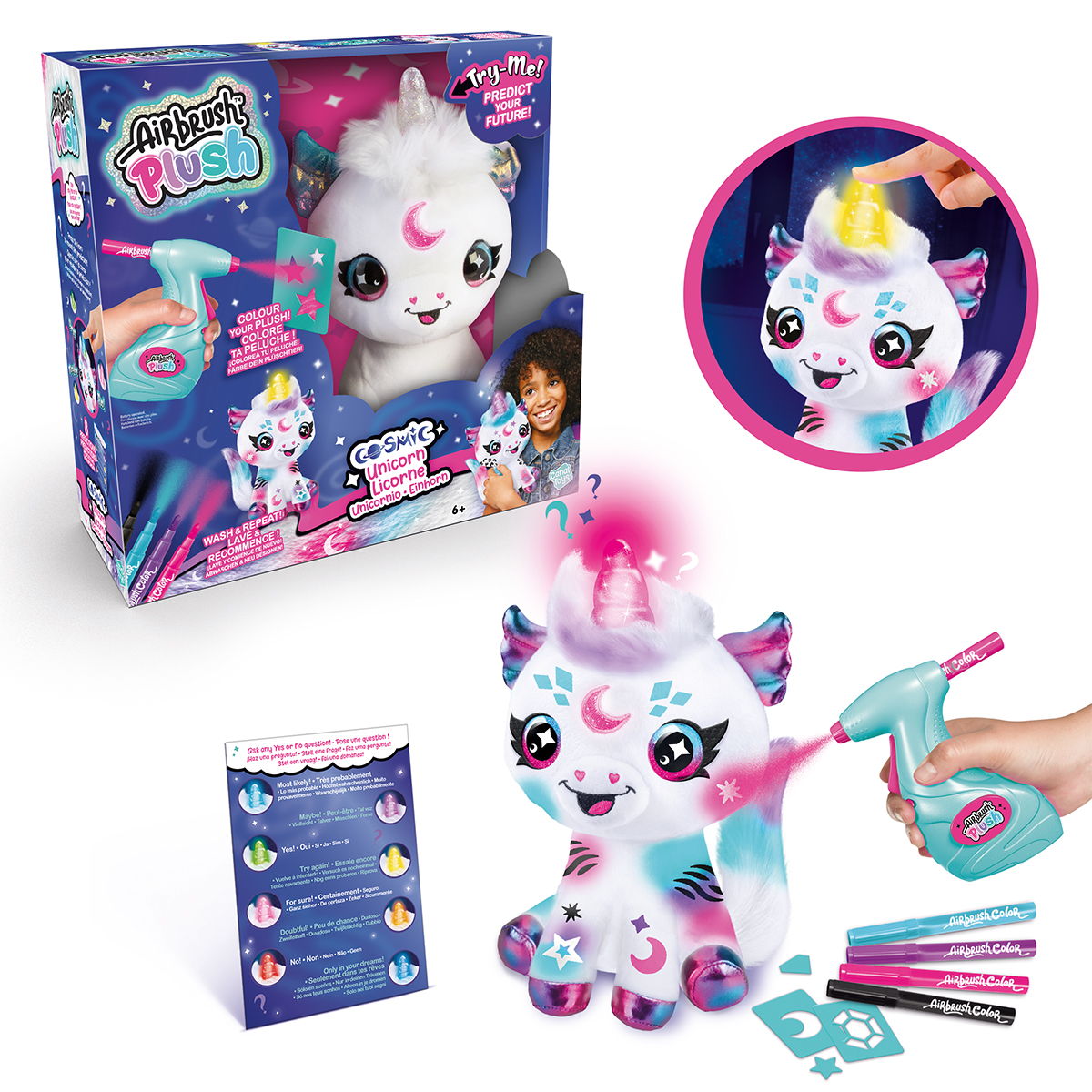 Personnalise ta peluche avec ton spray, tes marqueurs et tes pochoirs. Lave ta peluche et recommence ! Pose une question à ta licorne cosmique et appuie sur sa corne : elle s'illumine ! Déchiffre la réponse à ta question avec le guide de divination !