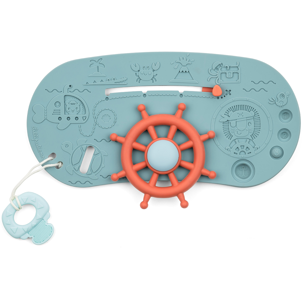 Un panneau de baignoire en silicone qui transforme la baignoire en bateau pirate : tourner la barre, choisir la destination, mettre le bateau à l'eau et explorer les boutons pop-it. Un jeu de rôle qui invite à de grandes aventures en mer .
