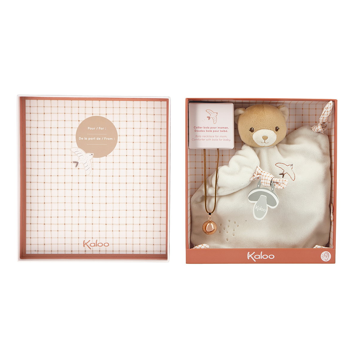 Un coffret de cadeau de naissance idéal dès la grossesse. Il est composé d'un magnifique collier bola en laiton pour la maman et d'un doudou ours de 24cm avec également un bola dans sa tête pour le bébé. Le bola est un bijou nommé 'appel des anges'. Porté par les femmes enceintes, il apporte une protection pour la mère et l'enfant, la paix et l'harmonie grâce au doux tintement qu'il émet. Dès les premiers instants in utero de bébé, il sera réconforté par le son cristallin du bola roulant sur le ventre arrondi de sa mère. À sa naissance, il retrouvera dans son doudou ours le même son pour se réconforter et rester dans un cocon de douceur. Ce doux éveil musical crée un environnement sécurisant et stimule l'attention et la curiosité de bébé. Une jolie broderie d'hirondelle orne le ventre tout doux en micro-velours de l'ours. Un soin particulier a été apporté dans la sélection des matériaux du doudou, composé d'au moins 75% de matières recyclées. Lavable en machine à 30°C, ces produits sont présentés dans une jolie boîte cadeau personnalisable, grâce à l'encart disponible sous le couvercle, et qui peut être réutilisée comme étui de rangement.