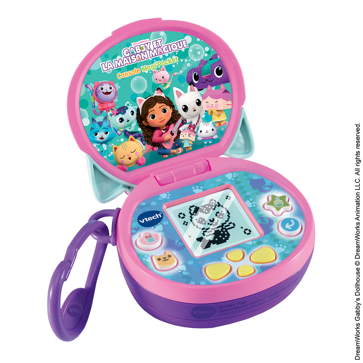 Gabby et la maison magique - Console Magi'Pocket 3-7 ans. Cette console nomade aux couleurs de la série permet aux enfants de découvrir les chiffres, les lettres et les formes avec le personnage de Marine! 4 boutons de navigation sont présents sur la console pour découvrir son contenu ainsi qu’un bouton ''Gabbychat du jour'' pour découvrir les personnages de la série (Pandy Pattes, P’tichou, Fée Minette, Gabby Sirène, DJ Miaou et Bébé Boite) et un bouton ''Balnéo science'' pour aider Marine à mesurer, ajouter et mélanger des ingrédients afin de créer des potions magiques ''for-miaou-dables'' (3 niveaux de difficulté). 4 jeux supplémentaires sont inclus dans la console: ''Bulles, bulles, bulles'': aide Marine a trouver les ingrédients pour créer des potions ''Mer-veilleuses''. ''Cache-cache'' avec les différents personnages: appuie sur les flèches pour trouver les personnages. Concours de danse de DJ Miaou: appuie sur les flèches pour reproduire les mouvements. Jeu du morpion avec Marine: appuie sur les flèches pour jouer et t'amuser. Avec écran rétroéclairé et mousqueton pour emporter sa console Magi’Pocket partout avec soi. Avec la vraie voix du personnage de Marine. Arrêt automatique et réglage du volume sonore. Boîte Try-Me. Fonctionne avec 3 piles LR03 fournies.