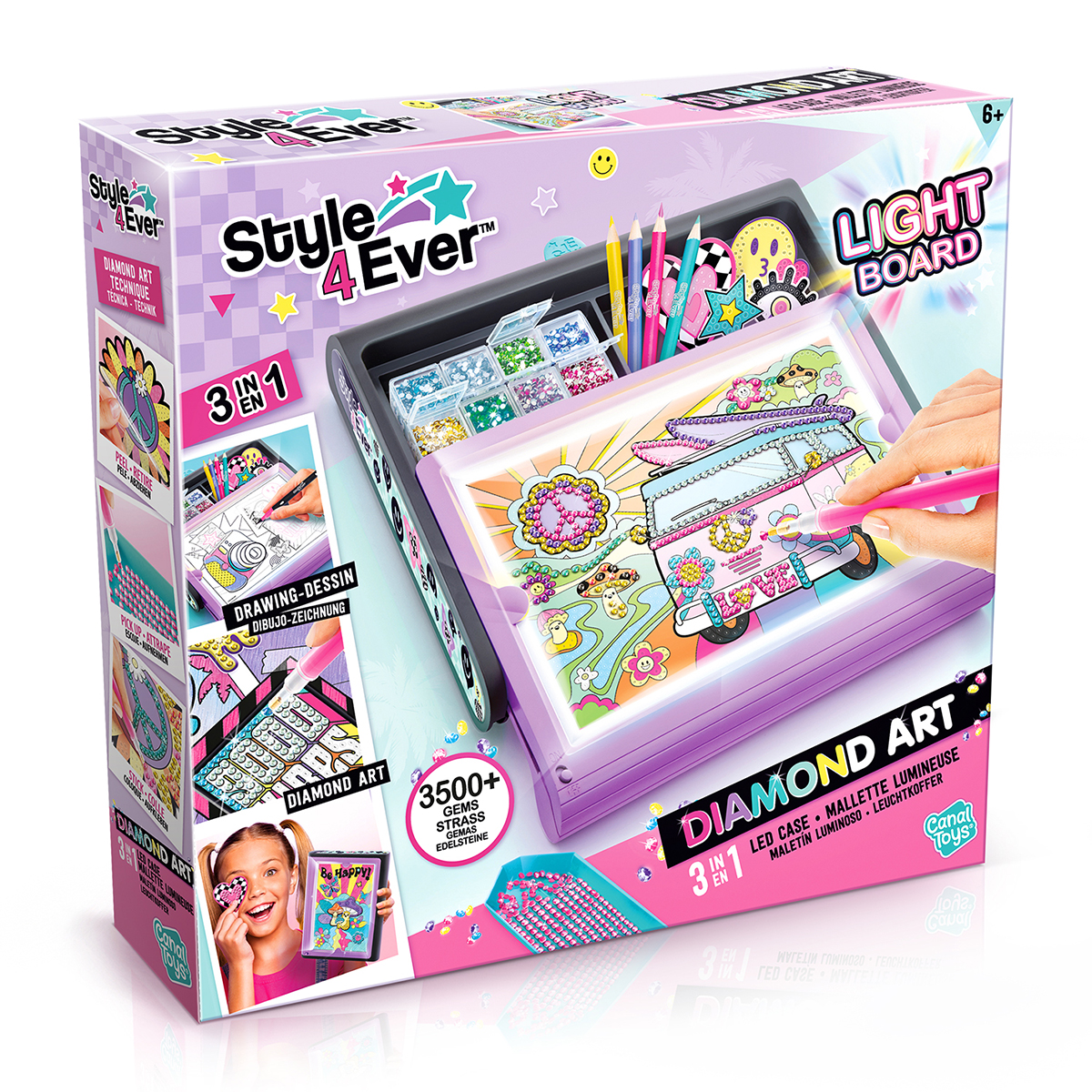 Ce coffret lumineux 3 en 1 est idéal pour réaliser des créations esquissées ou diamantées ! Tu peux reproduire et dessiner avec le tableau lumineux. Créer tes autocollants diamantés ou faire des posters avec les 2 techniques ! Facile à transporter, range tous tes accessoires à l'intérieur.