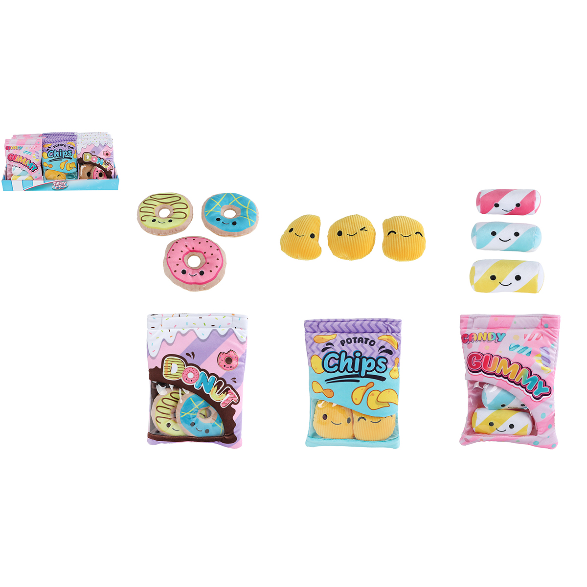 Peluche Fluffy Snack 3-fois assortis 21cm en display.