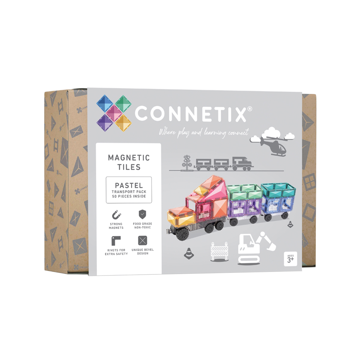 Ce nouveau coffret Pastel Transport de 50 pièces est idéal pour les passionnés de véhicules et inspire les enfants à créer des constructions toujours plus grandes et élaborées. Il comprend une base de transport réversible gris clair au design exclusif, deux bases de mouvement transparentes avec de véritables roues en caoutchouc et une sélection de blocs de construction magnétiques CONNETIX aux douces couleurs pastel. D'innombrables aventures attendent les jeunes esprits qui laisseront libre cours à leur imagination et concevront leurs propres véhicules. Voitures, camions, trains, avions, chariots élévateurs, camions de pompiers et bien plus encore! les possibilités sont infinies! Le coffret Pastel Transport de 50 pièces enrichit également la palette de couleurs des enfants avec huit teintes pastel! rose, framboise, pêche, menthe, vert émeraude, citron, violet et saphir. Il est idéal pour encourager l'apprentissage des sciences, des technologies, de l'ingénierie, des arts et des mathématiques (STEM) de manière ludique, en permettant aux enfants de découvrir le magnétisme, les formes et les couleurs par la construction.