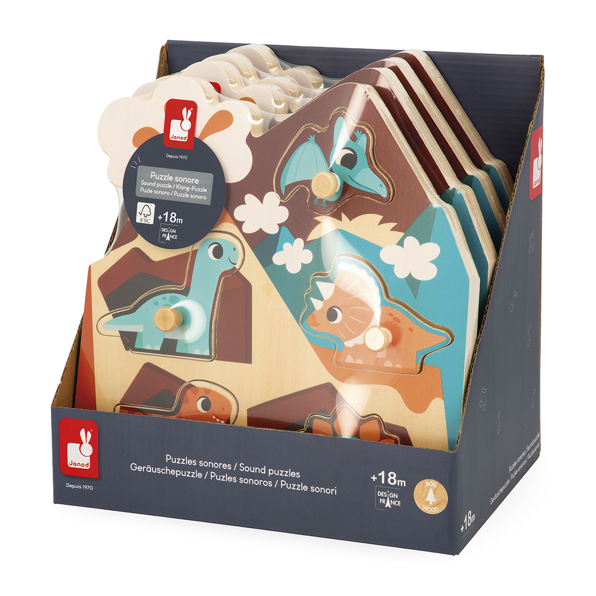 Connaissez-vous le cri des dinosaures ? Venez les découvrir grâce à ce joli puzzle sonore en bois. En posant la pièce de puzzle à la bonne place et en appuyant légèrement, le cri de l'animal correspondant retentit. Grâce aux tenons en bois, la prise en main des pièces est plus facile. Puzzle en bois avec 5 pièces à tenons. Piles fournies (2 x LR03 - AAA) et bouton on/off à l'arrière du puzzle. Développe la motricité fine et l'acuité auditive. Puzzle en bois. Pour les enfants à partir de 18 mois.