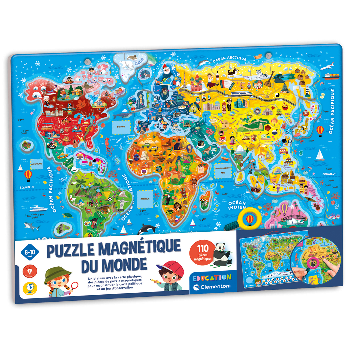Un puzzle magnétique coloré pour recomposer le planisphère du monde avec un jeu d’observation pour découvrir les particularités de chaque continent. Le puzzle, de dimensions 55 x 42 cm, est constitué d’un carton résistant, adapté pour jouer avec les aimants. Grâce au cordon pratique, le puzzle peut être accroché. Une multitude d’illustrations originales pour apprendre en s’amusant. 110 pièces magnétiques.