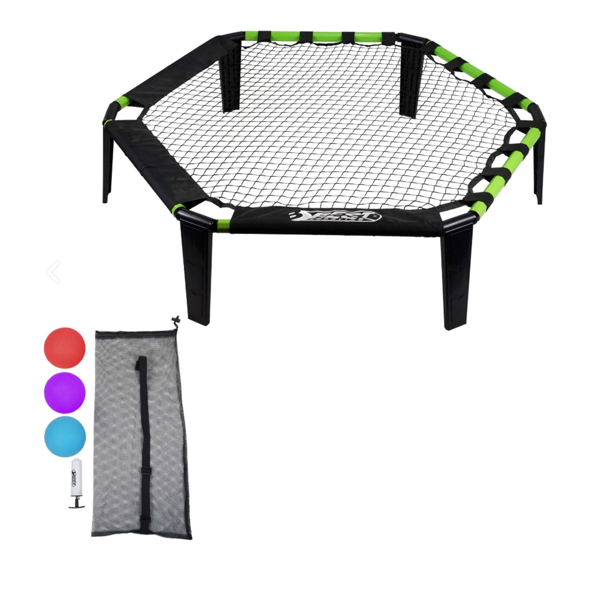 Roundnet-Set. Du plaisir pour tous les ages. Que ce oit dans la cour, sur la place, sur la prairie ou dans le jardin. Facile à montrer et à demonter. Filet avec cadre et supports au sol, 3 balles, sac de transport, instructions de jeu.