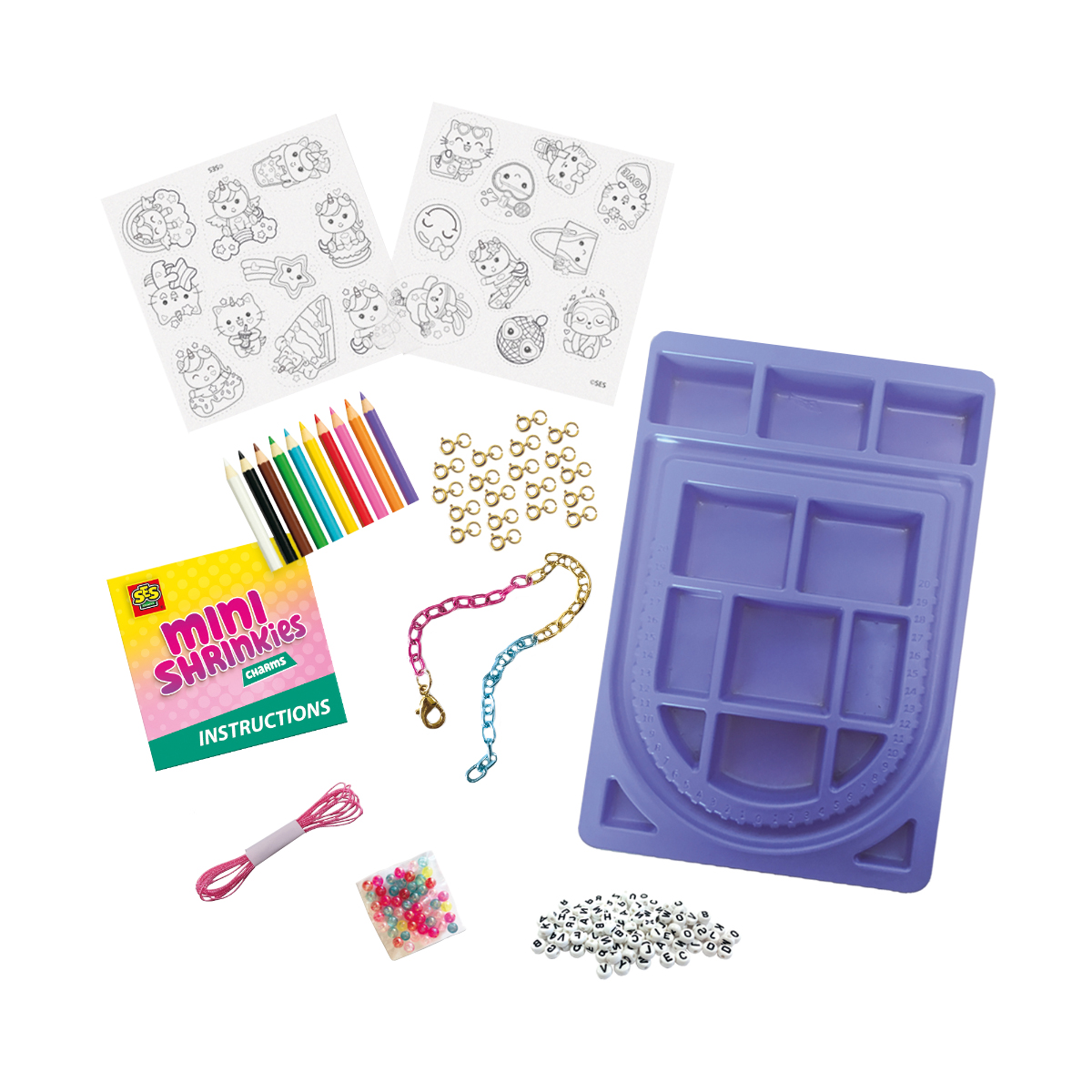Le studio de création de breloques Mini Shrinkies est un rêve devenu réalité pour les jeunes créateurs de bijoux. Les enfants peuvent concevoir leur propre collection, expérimenter avec les couleurs et les matières, et ranger soigneusement tout leur matériel pour leur prochaine création. C'est non seulement amusant et éducatif, mais aussi un excellent moyen d'échanger des breloques avec ses amis et de créer des combinaisons uniques. Le kit comprend: 10 crayons de couleur, un bracelet à maillons, 20 fermoirs et 20 anneaux, du fil rose pailleté, du film rétractable imprimé pour 20 breloques et un mode d'emploi.