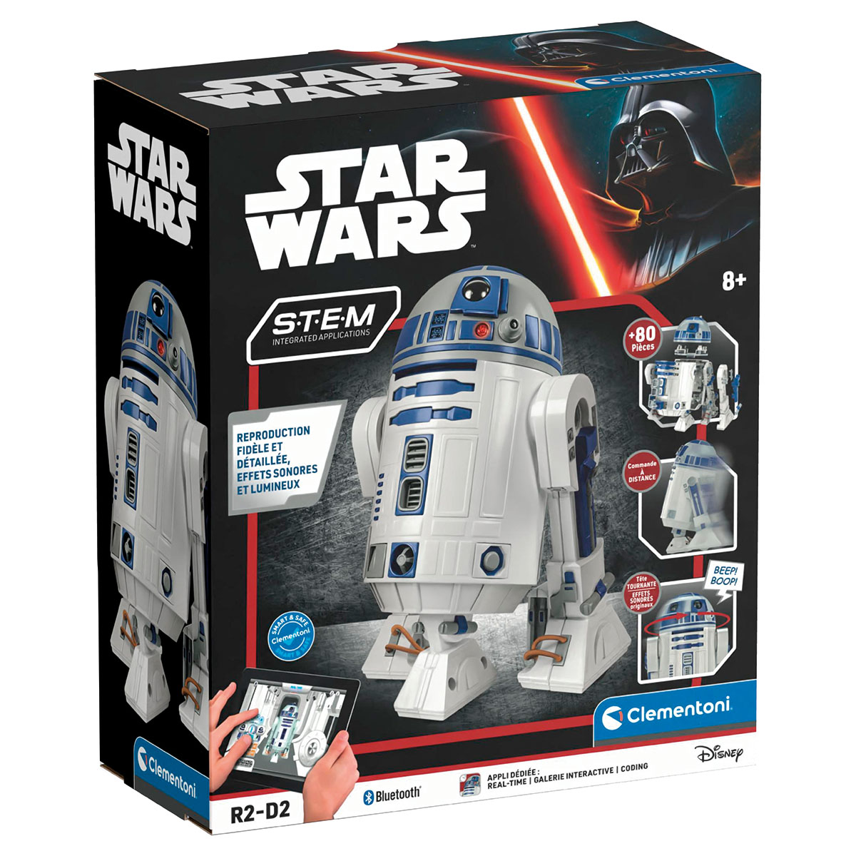 Star Wars R2D2 francais, plus de 80 pièces à assembler. En provenance directe de la galaxie de La Guerre des Étoiles: ton Robot R2D2. Assemble-le avec plus de 80 composants inclus, dont un haut-parleur, des LED et un moteur. Le haut-parleur et les LED (rouges et bleues) permettent d'émettre les lumières et les sons originaux de la saga. Les moteurs permettent au robot de bouger dans toutes les directions et de tourner la tête jusqu'à 180°. L'application dédiée propose 3 modes de jeu: temps réel (pour piloter ton robot depuis ton smartphone), coding (pour créer une suite de séquences) et galerie interactive (photos des personnages).