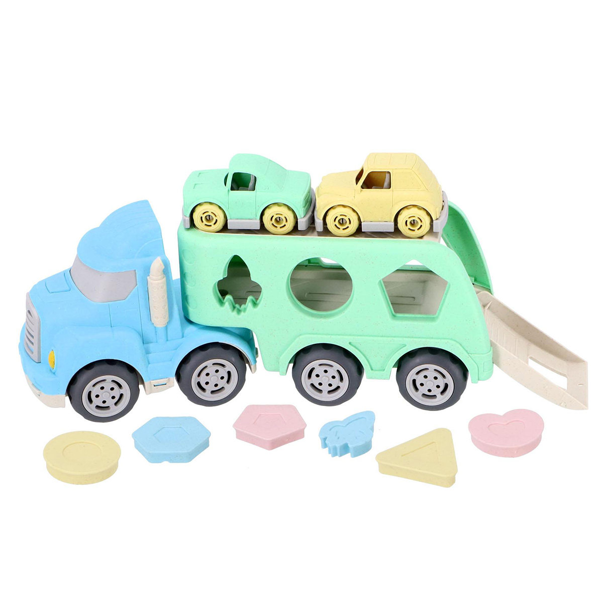 Camion de transport en bioplastique avec 2 petites voitures et boîte latérale à formes (6 formes). Développe la motricité fine , dès 3 ans.